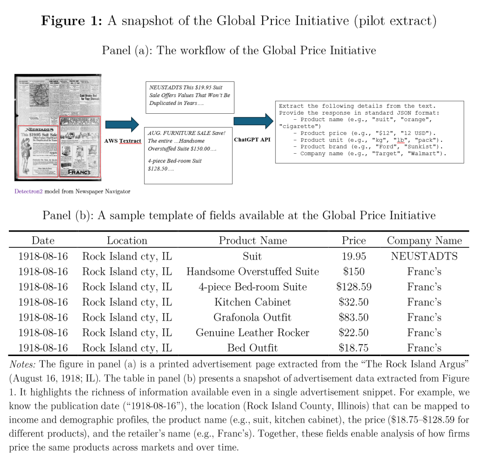 This research project develops a novel historical dataset on prices of tradable goods and non-tradable services (occupation-level wages), returns on financial assets (bank deposit rates across maturities), as well as firms' balance sheets, across U.S. counties and international borders from 1850 to 2000. Using advanced machine learning methods, I examine printed advertisements from millions of digitized historical newspapers in order to shed light on (i) price stickiness and firms' markup structures at both domestic and international scales, (ii) the heterogeneous and distributional effects of macroeconomic policies—such as tariffs and monetary shocks—on realized inflation experienced by households from different income groups and demographic compositions across geographies, and (iii) the differential factor prices for capital and labor (e.g., interest/mortgage rates across maturities, and offered wages across service occupations) in different regions. The resulting “Global Price Initiative” database provides researchers with a highly detailed, product-level dataset that supports transparency, replicability, and versatility in macroeconomic and international research on prices.